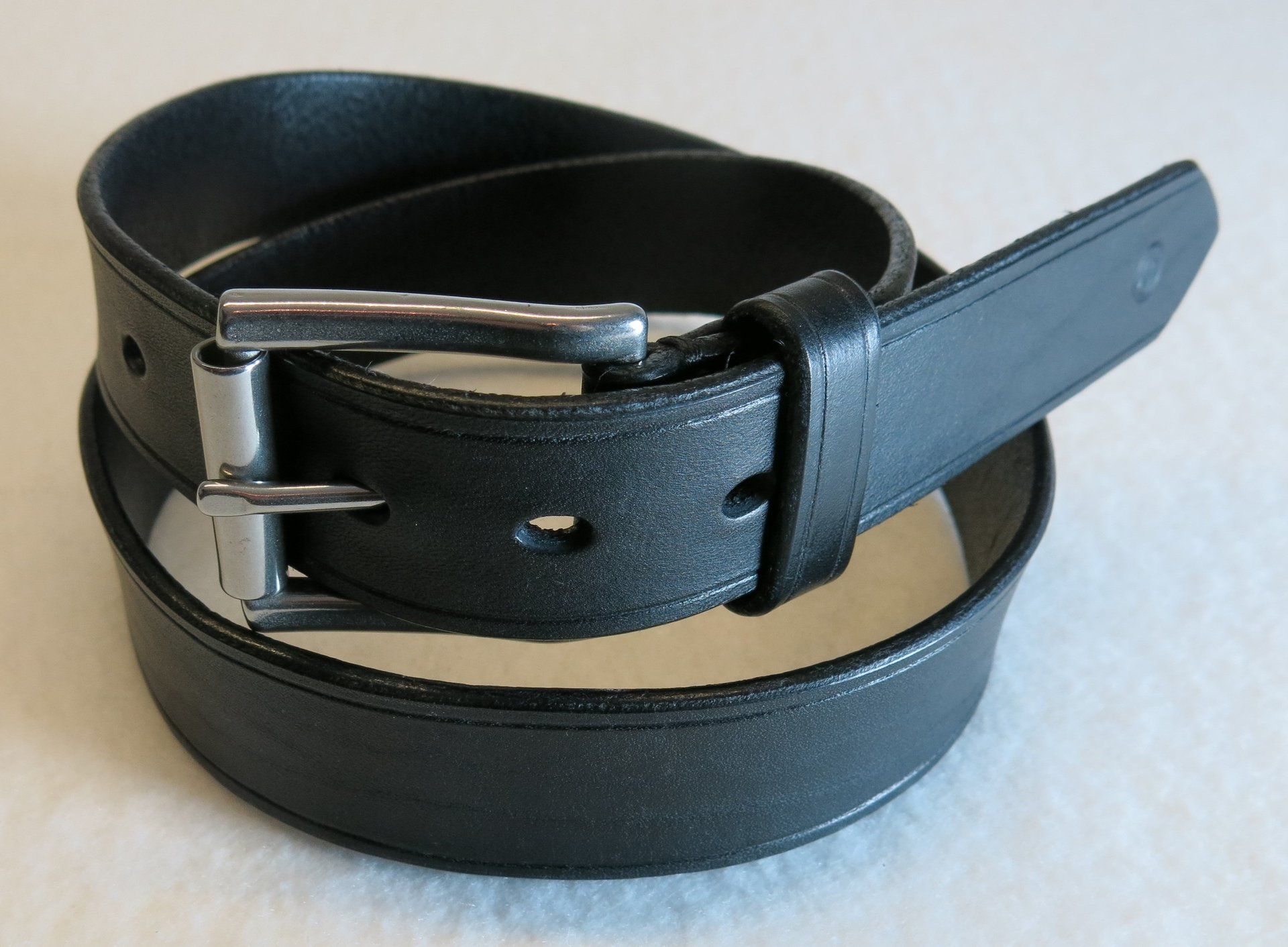 Alle Gürtel fertige ich aus vegetabil gegerbtem Rind- oder Büffelleder. Die Gürtel haben abgerundete und geglättete Kanten. Das Gürtelende kann rund oder spitz ausgeführt werden. Die Löcher sind grundsätzlich oval gestanzt.